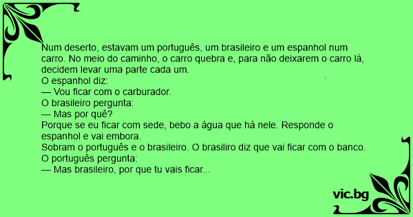Estavam três caras andando de fusca no deserto (um brasileiro , um americano e um portugues) eles estavam bem felizes até que o carro para , então cada um deles tinha que pegar uma parte do carro...