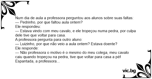 — Não professora o motivo é o mesmo do meu colega, meu cavalo caiu quando tropeçou na pedra, tive que voltar para casa a pé!