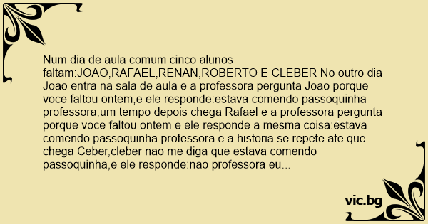 Num dia de aula comum cinco alunos faltam:JOAO,RAFAEL,RENAN,ROBERTO E CLEBER No outro dia Joao entra na sala de aula e a professora pergunta Joao porque voce faltou ontem,e ele responde:estava comendo passoquinha professora,um tempo depois chega Rafael e a professora pergunta porque voce faltou ontem e ele responde a mesma coisa:estava comendo passoquinha professora e a historia se repete ate que chega Ceber,cleber nao me diga que estava comendo passoquinha,e ele responde:nao professora eu sou a passoquinha