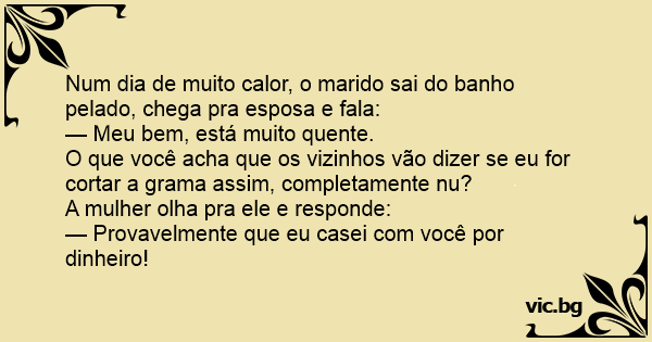 Num dia de muito calor, o marido sai do banho pelado, chega pra esposa e fala: — Meu bem, está muito quente. O que você acha que os vizinhos vão dizer se eu for cortar a grama assim, completamente nu? A mulher olha pra ele e responde: — Provavelmente que eu casei com você por dinheiro!