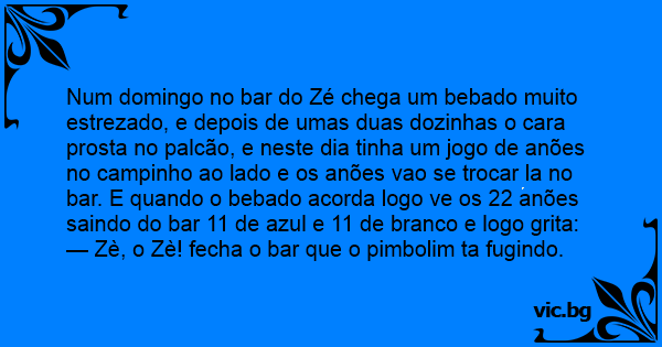 Num domingo no bar do Zé chega um bebado muito estrezado, e depois de umas duas dozinhas o cara prosta no palcão, e neste dia tinha um jogo de anões no campinho ao lado e os anões vao se trocar la no bar. E quando o bebado acorda logo ve os 22 anões saindo do bar 11 de azul e 11 de branco e logo grita: