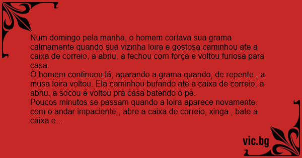Num domingo pela manha, o homem cortava sua grama calmamente quando sua vizinha loira e gostosa caminhou ate a caixa de correio, a abriu, a fechou com força e voltou furiosa para casa.
