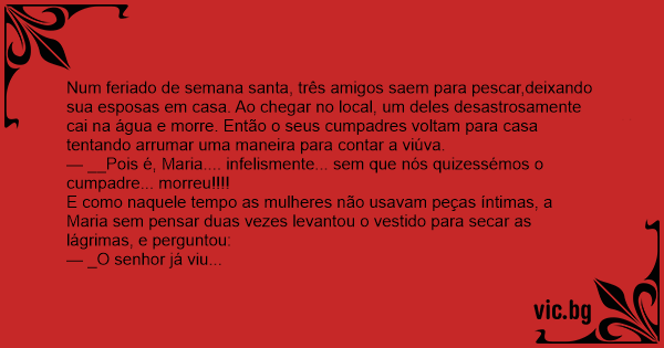Num feriado de semana santa, três amigos saem para pescar,deixando sua esposas em casa. Ao chegar no local, um deles desastrosamente cai na água e morre. Então o seus cumpadres voltam para casa tentando arrumar uma maneira para contar a viúva.