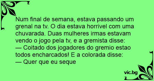 Num final de semana, estava passando um grenal na tv. O dia estava horrivel com uma chuvarada. Duas mulheres irmas estavam vendo o jogo pela tv, e a gremista disse: