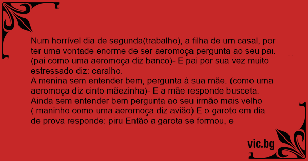 Num horrível dia de segunda(trabalho), a filha de um casal, por ter uma vontade enorme de ser aeromoça pergunta ao seu pai. (pai como uma aeromoça diz banco)- E pai por sua vez muito estressado diz: саrаlhо.
