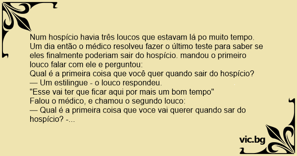 Num hospício havia três loucos que estavam lá po muito tempo. Um dia então o médico resolveu fazer o último теsте para saber se eles finalmente poderiam sair do hospício. mandou o primeiro louco falar com ele e perguntou: