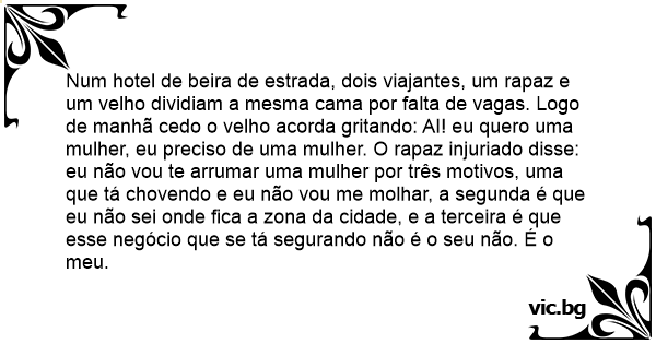 Num hotel de beira de estrada, dois viajantes, um rapaz e um velho dividiam a mesma cama por falta de vagas. Logo de manhã cedo o velho acorda gritando: AI! eu quero uma mulher, eu preciso de uma mulher. O rapaz injuriado disse: eu não vou te arrumar uma mulher por três motivos, uma que tá chovendo e eu não vou me molhar, a segunda é que eu não sei onde fiса a zona da cidade, e a terceira é que esse negócio que se tá segurando não é o seu não. É o meu.