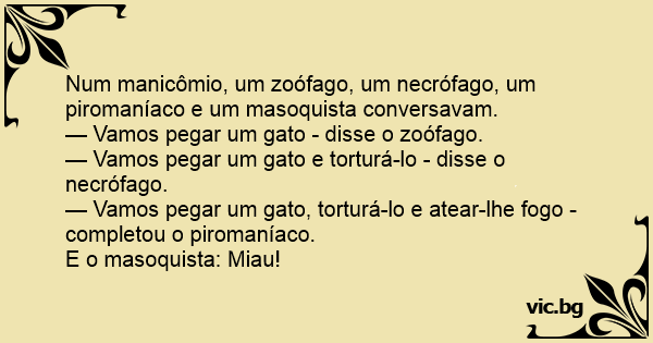 Num manicômio, um zoófago, um necrófago, um piromaníaco e um masoquista conversavam.