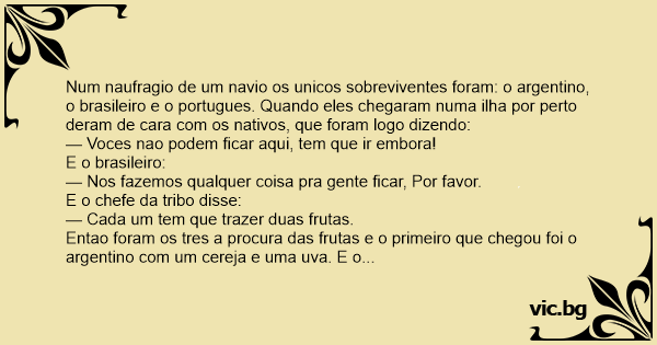 Num naufragio de um navio os unicos sobreviventes foram: o argentino, o brasileiro e o portugues. Quando eles chegaram numa ilha por perto deram de cara com os nativos, que foram logo dizendo:
