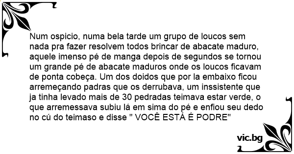 Num ospicio, numa bela tarde um grupo de loucos sem nada pra fazer resolvem todos brincar de abacate maduro, aquele imenso pé de manga depois de segundos se tornou um grande pé de abacate maduros onde os loucos ficavam de ponta cobeça. Um dos doidos que por la embaixo ficou arremeçando padras que os derrubava, um inssistente que ja tinha levado mais de 30 pedradas teimava estar verde, o que arremessava subiu lá em sima do pé e enfiou seu dedo no cú do teimaso e disse " VOCÊ ESTÁ É PODRE"