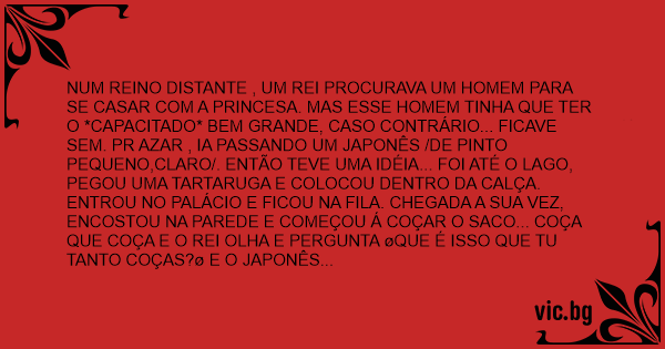 NUM REINO DISTANTE , UM REI PROCURAVA UM HOMEM PARA SE CASAR COM A PRINCESA. MAS ESSE HOMEM TINHA QUE TER O *CAPACITADO* BEM GRANDE, CASO CONTRÁRIO... FICAVE SEM. PR AZAR , IA PASSANDO UM JAPONÊS /DE PINTO PEQUENO,CLARO/. ENTÃO TEVE UMA IDÉIA... FOI ATÉ O LAGO, PEGOU UMA TARTARUGA E COLOCOU DENTRO DA CALÇA. ENTROU NO PALÁCIO E FICOU NA FILA. CHEGADA A SUA VEZ, ENCOSTOU NA PAREDE E COMEÇOU Á COÇAR O SACO... COÇA QUE COÇA E O REI OLHA E PERGUNTA øQUE É ISSO QUE TU TANTO COÇAS?ø E O JAPONÊS ENFIA A MÃO DENTRO DA CALÇA, TIRA A TARTARUGA DE DENTRO DA CALÇA, A JOGA NO CHÃO E OLHA BEM NA CARA DO REI E DIZ: