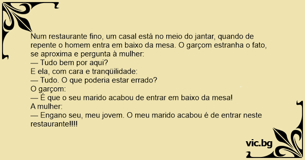 Num restaurante fino, um casal está no meio do jantar, quando de repente o homem entra em baixo da mesa. O garçom estranha o fato, se aproxima e pergunta à mulher:
