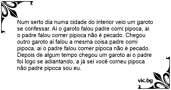 Num serto dia numa cidade do interior veio um garoto se confessar. Ai o garoto falou padre comi pipoca, ai o padre falou comer pipoca não é pecado. Chegou outro garoto ai falou a mesma coisa padre comi pipoca, ai o padre falou comer pipoca não é pecado. Depois de algum tempo chegou um garoto ai o padre foi logo se adiantando, a já sei você comeu pipoca não padre pipoca sou eu.