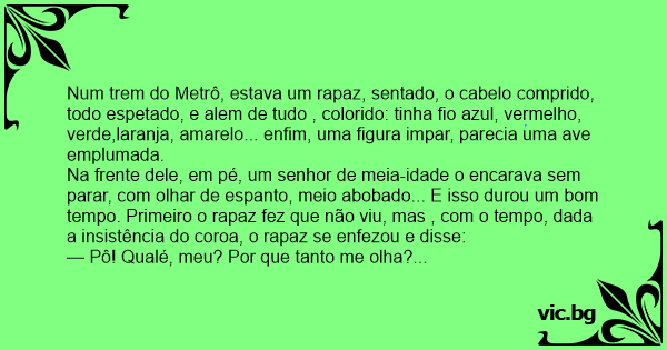 Num trem do Metrô, estava um rapaz, sentado, o cabelo comprido, todo espetado, e alem de tudo , colorido: tinha fio azul, vermelho, verde,laranja, amarelo... enfim, uma figura impar, parecia uma ave emplumada.