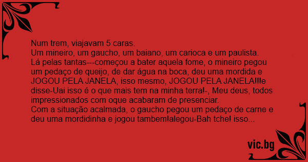 Com a situação acalmada, o gaucho pegou um pedaço de carne e deu uma mordidinha e jogou tambem!alegou-Bah tche! isso é o que mais tem na minha terra!- Todos de boca caída por isso!Mais a diante, o carioca pegou um baseado gigante(que parecia um charuto cubano),deu uma puchada,prendeu,soltou e jogou pela janela!Todos novamente espantados com aquilo!Completou o carioca-Æ Valeu? isso é o que mais tem na minha terra!- Um pouco mais a frente, o paulista olhou pra direita-----olhou pra esquerda-----,levantou, pegou o baiano e jogou pela janela e...