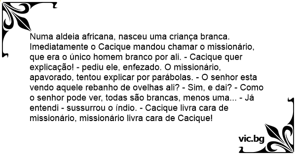 Numa aldeia africana, nasceu uma criança branca. Imediatamente o Cacique mandou chamar o missionário, que era o único homem branco por ali. - Cacique quer explicação! - pediu ele, enfezado. O missionário, apavorado, tentou explicar por parábolas. - O senhor esta vendo aquele rebanho de ovelhas ali? - Sim, e dai? - Como o senhor pode ver, todas são brancas, menos uma... - Já entendi - sussurrou o índio. - Cacique livra cara de missionário, missionário livra cara de Cacique!