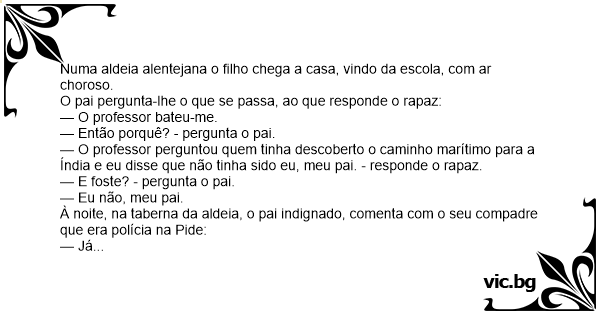 — O professor perguntou quem tinha descoberto o caminho marítimo para a Índia e eu disse que não tinha sido eu, meu pai. - responde o rapaz.