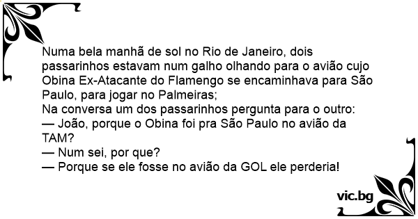 Numa bela manhã de sol no Rio de Janeiro, dois passarinhos estavam num galho olhando para o avião cujo Obina Ex-Atacante do Flamengo se encaminhava para São Paulo, para jogar no Palmeiras;