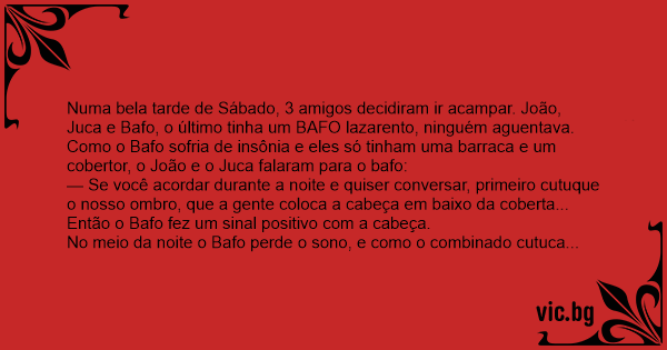 Numa bela tarde de Sábado, 3 amigos decidiram ir acampar. João, Juca e Bafo, o último tinha um BAFO lazarento, ninguém aguentava.