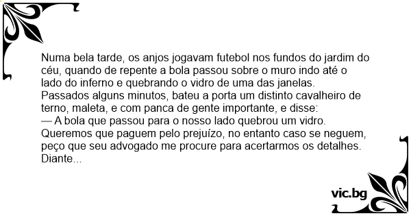Numa bela tarde, os anjos jogavam futebol nos fundos do jardim do céu, quando de repente a bola passou sobre o muro indo até o lado do inferno e quebrando o vidro de uma das janelas.
