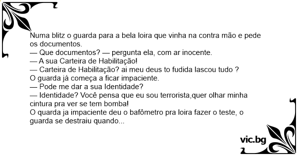 O quarda ja impaciente deu o bafômetro pra loira fazer o теsте, o guarda se destraiu quando ele olhou pra loira ele falou , o mossa o bafômetro é pra assoprar não pra сhuраr!