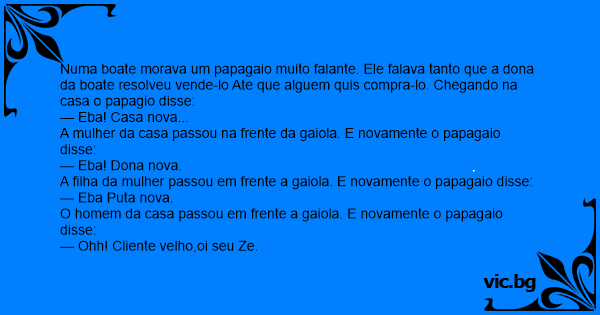 Numa boate morava um papagaio muito falante. Ele falava tanto que a dona da boate resolveu vende-lo Ate que alguem quis compra-lo. Chegando na casa o papagio disse: