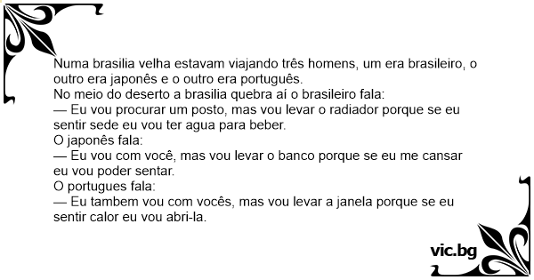 Numa brasilia velha estavam viajando três homens, um era brasileiro, o outro era japonês e o outro era português.