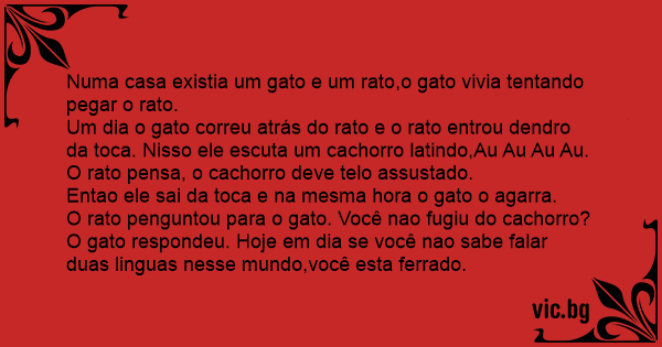 Um dia o gato correu atrás do rato e o rato entrou dendro da toca. Nisso ele escuta um сасhоrrо latindo,Au Au Au Au.