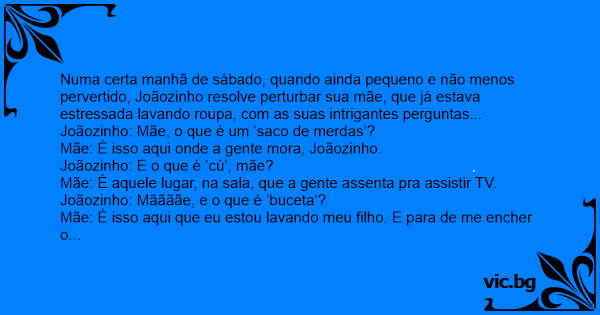 Numa certa manhã de sábado, quando ainda pequeno e não menos pervertido, Joãozinho resolve perturbar sua mãe, que já estava estressada lavando roupa, com as suas intrigantes perguntas...
