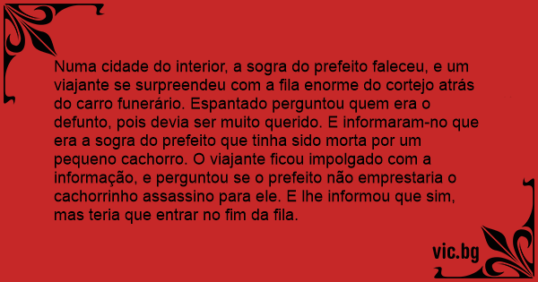 Numa cidade do interior, a sogra do prefeito faleceu, e um viajante se surpreendeu com a fila enorme do cortejo atrás do carro funerário. Espantado perguntou quem era o defunto, pois devia ser muito querido. E informaram-no que era a sogra do prefeito que tinha sido morta por um pequeno сасhоrrо. O viajante ficou impolgado com a informação, e perguntou se o prefeito não emprestaria o cachorrinho assassino para ele. E lhe informou que sim, mas teria que entrar no fim da fila.