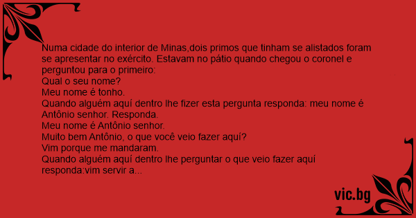 Numa cidade do interior de Minas,dois primos que tinham se alistados foram se apresentar no exército. Estavam no pátio quando chegou o coronel e perguntou para o primeiro:
