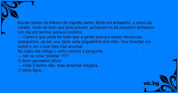 Numa cidade do interior do espirito santo, tinha um armazem, o unico da cidade, onde de tudo que procuravam, achavam no tal pequeno armazem.
