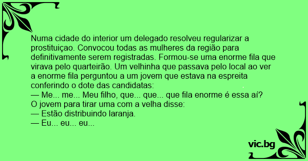 Numa cidade do interior um delegado resolveu regularizar a prostituiçao. Convocou todas as mulheres da região para definitivamente serem registradas. Formou-se uma enorme fila que virava pelo quarteirão. Um velhinha que passava pelo local ao ver a enorme fila perguntou a um jovem que estava na espreita conferindo o dote das candidatas: