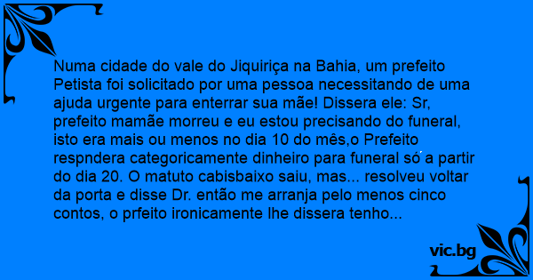 Numa cidade do vale do Jiquiriça na Bahia, um prefeito Petista foi solicitado por uma pessoa necessitando de uma ajuda urgente para enterrar sua mãe! Dissera ele: Sr, prefeito mamãe morreu e eu estou precisando do funeral, isto era mais ou menos no dia 10 do mês,o Prefeito respndera categoricamente dinheiro para funeral só a partir do dia 20. O matuto cabisbaixo saiu, mas... resolveu voltar da porta e disse Dr. então me arranja pelo menos cinco contos, o prfeito ironicamente lhe dissera tenho cinco reais e lhe entregou, ele agradeceu e quando saia o Prefeito perguntou pra que os cinco reais, rapidamente o matuto respondera, prá comprar sal grosso prá sargar mamãe prá aguentar até o dia 20.