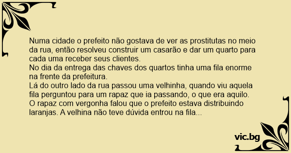 Numa cidade o prefeito não gostava de ver as prostitutas no meio da rua, então resolveu construir um casarão e dar um quarto para cada uma receber seus clientes.