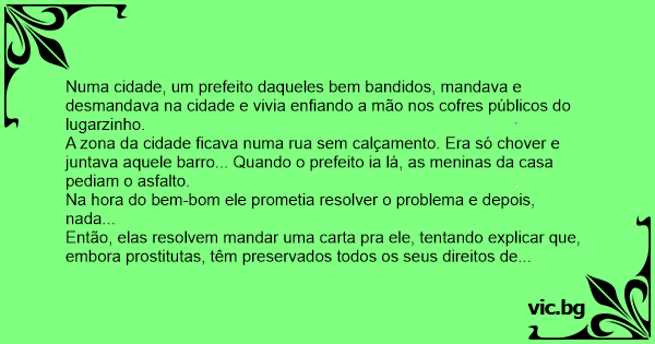 Numa cidade, um prefeito daqueles bem bandidos, mandava e desmandava na cidade e vivia enfiando a mão nos cofres públicos do lugarzinho.