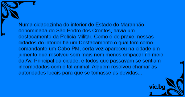 Numa cidadezinha do interior do Estado do Maranhão denominada de São Pedro dos Crentes, havia um destacamento da Polícia Militar. Como é de praxe, nessas cidades do interior há um Destacamento o qual tem como comandante um Cabo PM, certa vez apareceu na cidade um jumento que resolveu sem mais nem menos empacar no meio da Av. Principal da cidade, e todos que passavam se sentiam incomodados com o tal animal. Alguém resolveu chamar as autoridades locais para que se tomasse as devidas providências. chamem o Prefeito, gritou alguém!, O Prefeito atendendo o chamado, veio empurrou o jumento, bateu nele e nada do animal sair. Chamem o Juiz! O juiz veio e com toda a sua eloquência jurídica ordenou que o animal saísse dali e de nada adiantou. Chamem o Promotor, nisso chegou o Promotor ordenando mais uma vez que o animal saísse dali sob pena de responder pelo сriме de desobediência e de nada adiantou. Nisso, alguém falou: