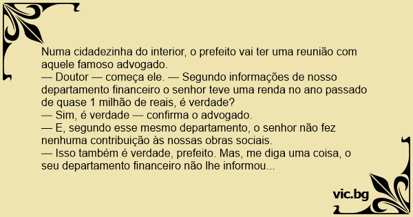 — Isso também é verdade, prefeito. Mas, me diga uma coisa, o seu departamento financeiro não lhe informou que a minha mãe morreu de câncer o ano passado e que a conta do hospital ficou em quase 200 mil reais?
