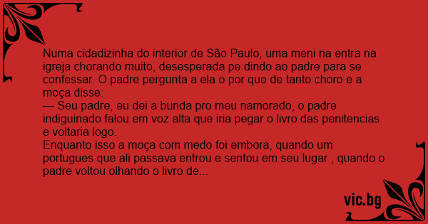 — Seu padre, eu dei a bunda pro meu namorado, o padre indiguinado falou em voz alta que iria pegar o livro das penitencias e voltaria logo.