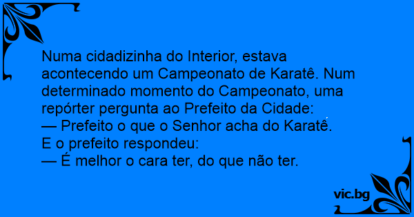 Numa cidadizinha do Interior, estava acontecendo um Campeonato de Karatê. Num determinado momento do Campeonato, uma repórter pergunta ao Prefeito da Cidade: