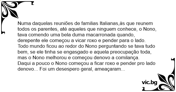 Numa daquelas reuniões de familias Italianas,às que reunem todos os parentes, até aqueles que ninguem conhece, o Nono, tava comendo uma bela duma macarronada quando, derepente ele começou a vicar roxo e pender para o lado.