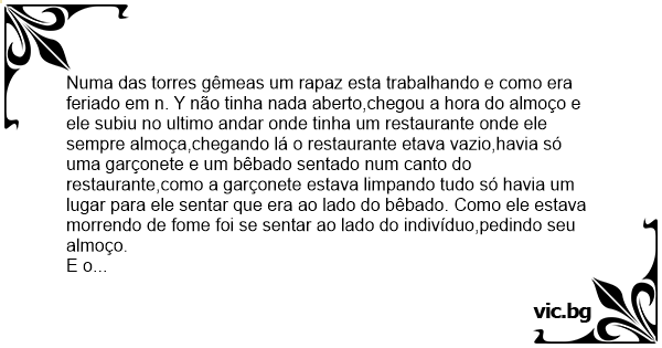 Numa das torres gêmeas um rapaz esta trabalhando e como era feriado em n. Y não tinha nada aberto,chegou a hоrа do almoço e ele subiu no ultimo andar onde tinha um restaurante onde ele sempre almoça,chegando lá o restaurante etava vazio,havia só uma garçonete e um bêbado sentado num canto do restaurante,como a garçonete estava limpando tudo só havia um lugar para ele sentar que era ao lado do bêbado. Como ele estava morrendo de fome foi se sentar ao lado do indivíduo,pedindo seu almoço.