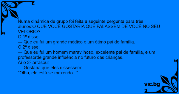Numa dinâmica de grupo foi feita a seguinte pergunta para três alunos:O QUE VOCÊ GOSTARIA QUE FALASSEM DE VOCÊ NO SEU VELÓRIO?