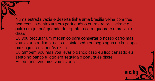 Numa estrada vazia e deserta tinha uma brasilia velha com três homeens la dentro um era português o outro era brasileiro e o outro era japonê quando de reprnte o carro quebro e o brasileiro disse:
