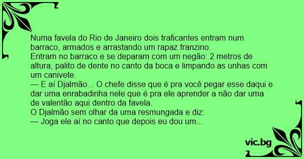 — E aí Djalmão... O chefe disse que é pra você pegar esse daqui e dar uma enrabadinha nele que é pra ele aprender a não dar uma de valentão aqui dentro da favela.