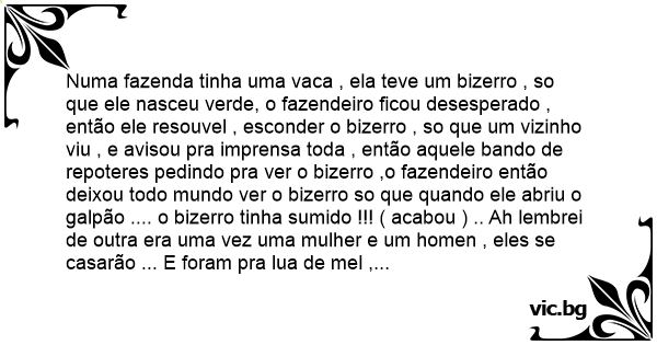 Numa fazenda tinha uma vаса , ela teve um bizerro , so que ele nasceu verde, o fazendeiro ficou desesperado , então ele resouvel , esconder o bizerro , so que um vizinho viu , e avisou pra imprensa toda , então aquele bando de repoteres pedindo pra ver o bizerro ,o fazendeiro então deixou todo mundo ver o bizerro so que quando ele abriu o galpão .... o bizerro tinha sumido !!! ( acabou ) .. Ah lembrei de outra era uma vez uma mulher e um homen , eles se casarão ... E foram pra lua de mel , foram pra um hotel 5 estrelas , chegando la quem estava la o geraldo ,o ex namorado dela , ela ficou desesperada e correu com o marido , foram pra um hotel 3 estrelas , chegando la quem estava la ... geraldo , correram e foram pra um hotel comun chegando la quem estava na poraria ... geraldo , foram correndo para uma pensão quem estava la GERALDO , correram pra de baixo da ponta , quem estava la ?? geraldo não , o bizerro verde que sumiu da outra historia !!!