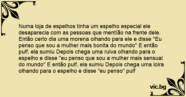 Então certo dia uma morena olhando para ele e disse "Eu penso que sou a mulher mais bonita do mundo" E então pulf, ela sumiu Depois chega uma ruiva olhando para o espelho e disse "eu penso que sou a mulher mais sensual do mundo" E então pulf, ela sumiu Depois chega uma loira olhando para o espelho e disse "eu penso" pulf