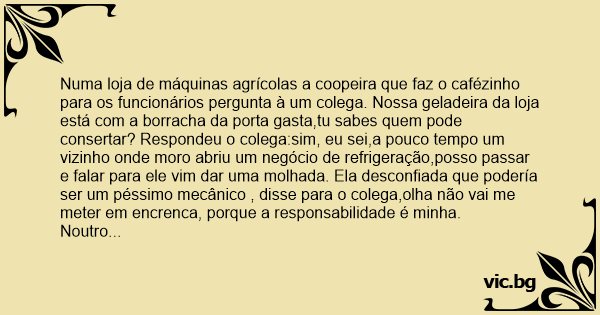 Numa loja de máquinas agrícolas a coopeira que faz o cafézinho para os funcionários pergunta à um colega. Nossa geladeira da loja está com a borracha da porta gasta,tu sabes quem pode consertar? Respondeu o colega:sim, eu sei,a pouco tempo um vizinho onde moro abriu um negócio de refrigeração,posso passar e falar para ele vim dar uma molhada. Ela desconfiada que podería ser um péssimo mecânico , disse para o colega,olha não vai me meter em encrenca, porque a responsabilidade é minha.