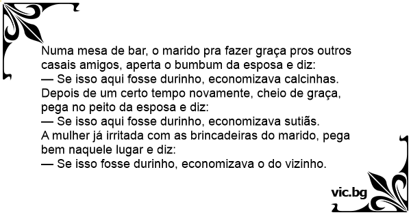 Numa mesa de bar, o marido pra fazer graça pros outros casais amigos, aperta o bumbum da esposa e diz: