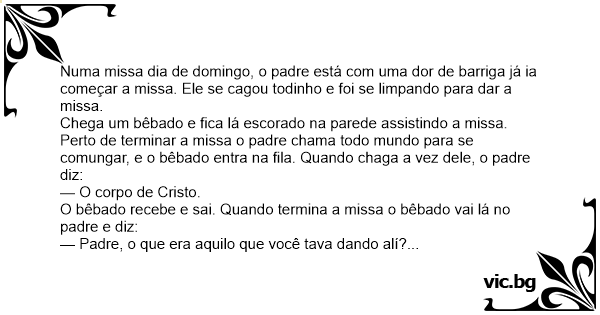 O bêbado recebe e sai. Quando termina a missa o bêbado vai lá no padre e diz: